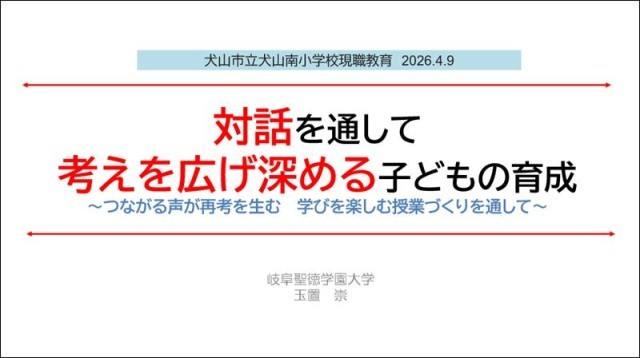 校長先生としばし懇談。13時30分から14時20分まで、今年度の犬山南小の研究方針を踏まえて作った講演プレゼン「対話を通して考えを広げ深める子どもの育成 ~つながる声が再考を生む 学びを楽しむ授業づくりを通して~」。研究方針の確かさを次期学習指導要領から価値づけ、対話に焦点を絞って、学校が目指す対話力をつけるための手立てを様々な材料をもとに伝える。もちろん時折話し合ってもらい、意見発表をしてもらっての展開。