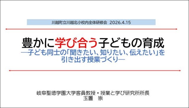 14時30分から全体研修会。研究主任から15分間の研修計画提案。その後は僕に与えていただいた時間。まずは飛び込み授業の感想交流をしてもらい、新卒3名の方から感想をもらう。その後は僕の振り返り(教材研究、目指したもの、子どものとらえなど)を「飛び込み授業で心掛けていること」と題して伝える。その後、この学校の本年度の研修計画を価値づけ。動画を見せながら計画の具現化に向けてのヒントを提供。予定より20分ほど早めに終了。