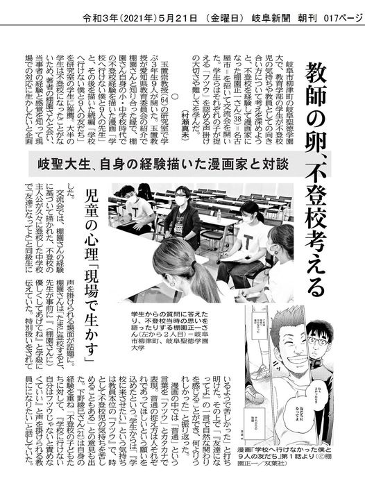 昨晩から続く強雨。警報が出ていて、心配しながら大学へ向かう。途中のコンビニで岐阜新聞購入。記者の村瀬さんから「本日付で先日の交流会の記事が掲載されます」と連絡があり、楽しみにして手に入れる。とても嬉しい記事。紙面はこちらでぜひお読みください。