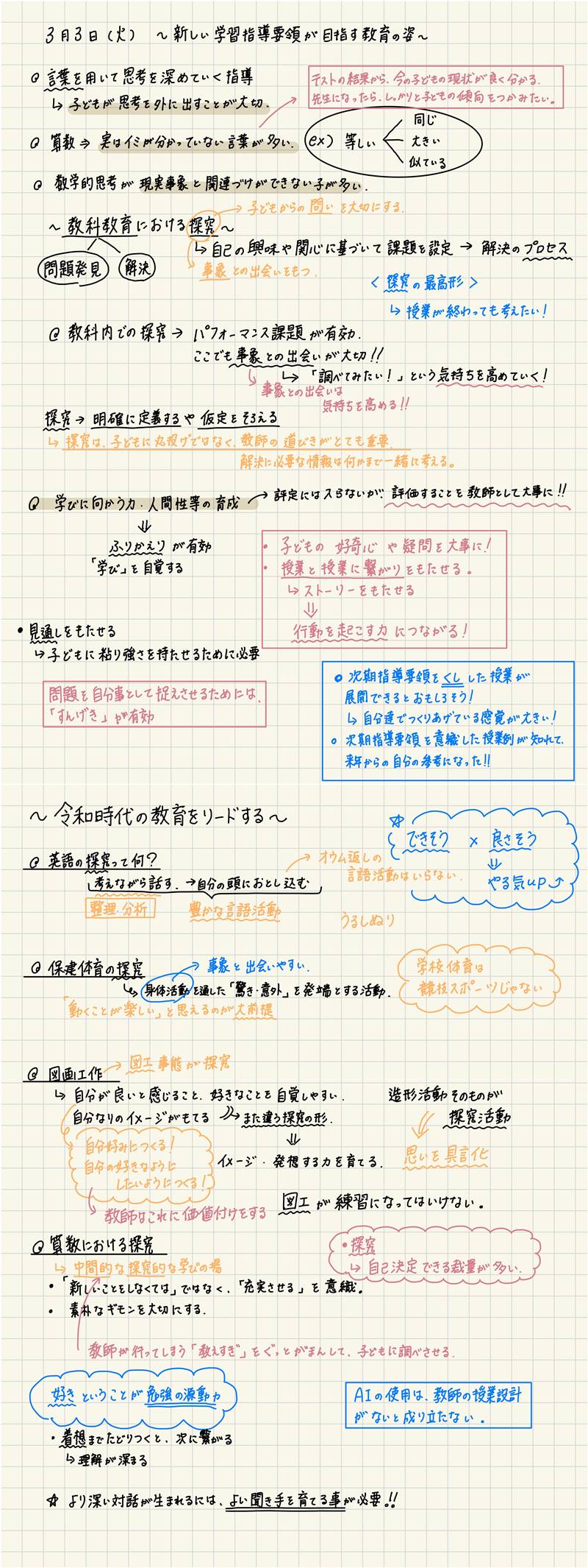 まず1つ目は、和田先生、栗木先生、パネルディスカッションの際のパネラーの先生方が、口々に言っておられた、「子どもの言葉」をとても大切にするということ。また、「子ども”たち”」ではなく、「一人ひとりの子ども」であるということです。