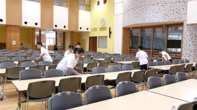 ふれあいホールでは、給食の前後に各学年で机拭きを行っています。しかし低学年の机は、食後にどうしても拭き残しがあって汚れたままになっていることもあります。そんな中、先週から7年生の有志数人がふれあいホールの机拭きに来てくれています。最初は机だけだったのが、いすもピカピカに拭いてくれるようになり、机の整頓もしてくれました。そんな姿を見て、掃除にきた4年生も一緒に机を整頓してくれていました。上級生の姿をみて自然に行動ができるのは、すばらしいことです。食事の場をきれいに維持できるよう、一人一人が意識できるとよいなと思います。