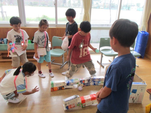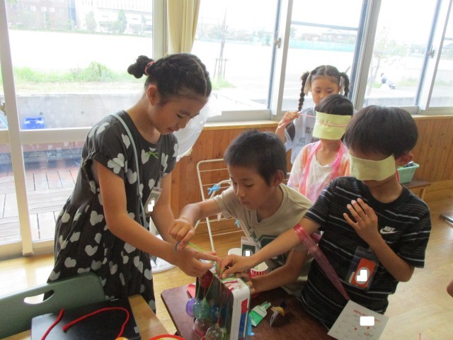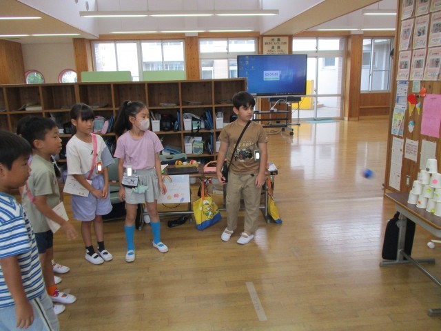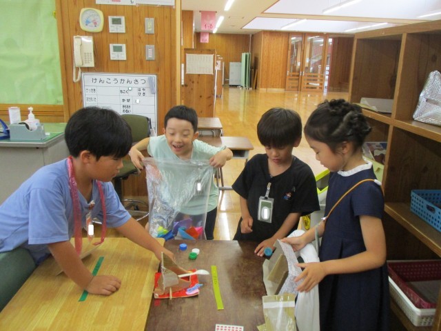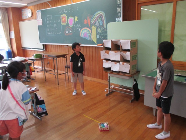 生活科の学習で「おもちゃランド」を開きました。この日のために、グループの友達と試行錯誤しながら作ったおもちゃたち。どのグループも、みんな笑顔になって、楽しく遊んでもらうことができました。ただ遊んでもらうだけでなく、「よかったね、上手だよ」、「惜しかったね、もう一度やってみていいよ」などと、優しい声掛けもしてくれる2年生に、成長を感じました。どのグループも「おもちゃランド」、大成功でした!