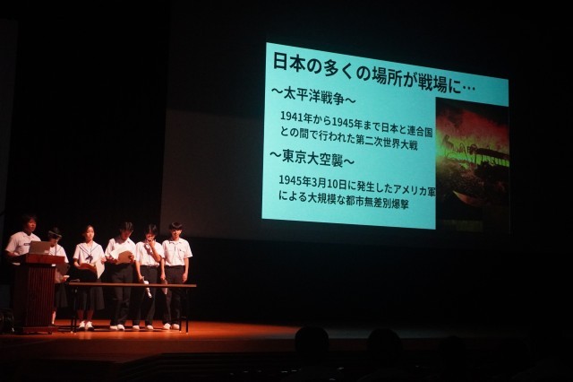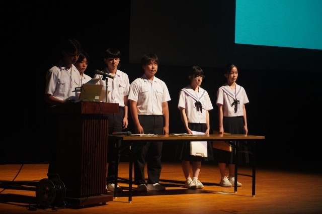 広島派遣発表は、飛島村の平和推進事業で広島に行った生徒による発表を聞きました。