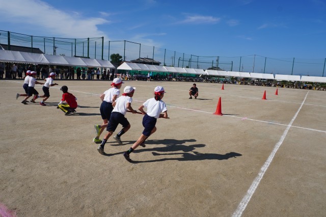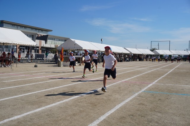 写真は「開会式」、「3・4年生による台風のめがね」、「1・2年生による徒競走」、「7~9年生によるスウェーデンリレー」「5・6年生による表現」の様子です。