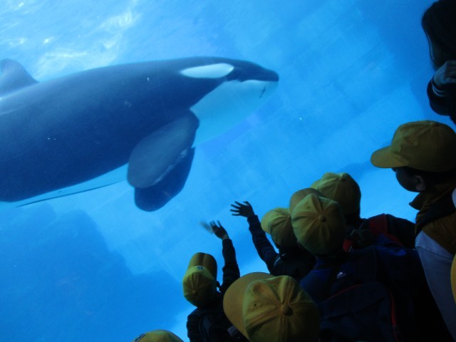 11月18日火曜日、2年生は社会見学で名古屋港水族館へ行きました。シャチ、バンドウイルカ、ベルーガなどといった、たくさんの海の生き物を見ることができました。「シャチって、とても大きいんだね。」、「イルカは泳ぐ時に、背泳ぎみたいにしているね。」などと、発見したことをしっかりとメモに取りました。イルカショーでは、イルカたちが息を合わせてジャンプをする姿や、速く泳ぐ姿に感動していました。