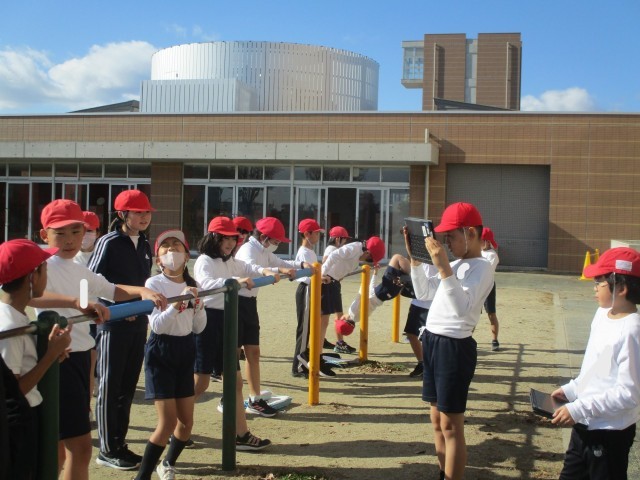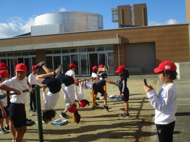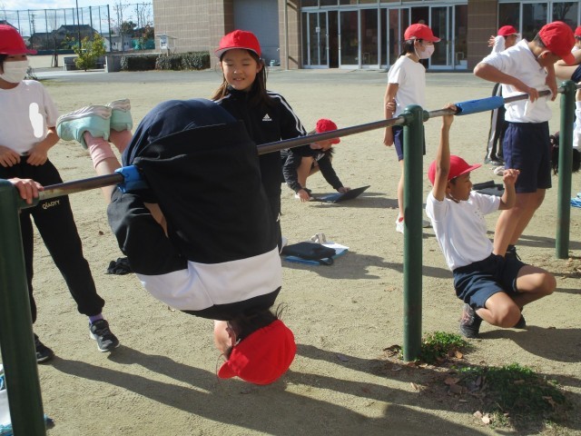気持ちのよい青空の下、鉄棒で上がり技・回り技・下り技を組み合わせて発表できるように、一つ一つの技の練習をしています。逆上がりができないので、タオルを持って鉄棒から離れないように練習したり、補助板を使って練習したり、自分に合った練習方法で行っています。なかなか習得できず四苦八苦していますが、みんな手を抜かずに練習しています。できない友達はタブレットで撮影してもらって、自分の欠点を見つけるようにしています。最終日に、少しでも上達した状態で発表会をしたいですね。それまで頑張りましょう。