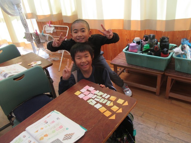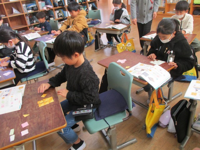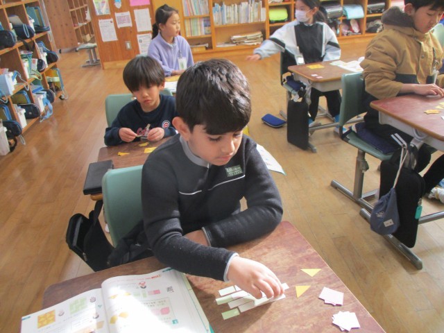 算数科「三角形と四角形」では、長方形や正方形、直角三角形の色紙を並べて、模様づくりを行いました。「正方形を2つ並べたら長方形ができるよ」、「直角三角形2つだと正方形ができるね」などと、形の特徴を発見をしながら、色々な模様づくりをしました。敷き詰め方を工夫し、いろいろな形を作ってみるなど、楽しみながら三角形と四角形を学びました。