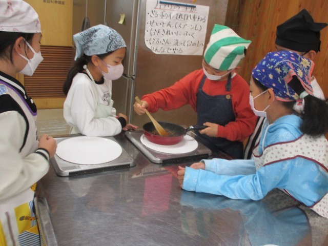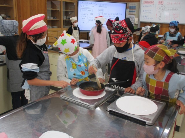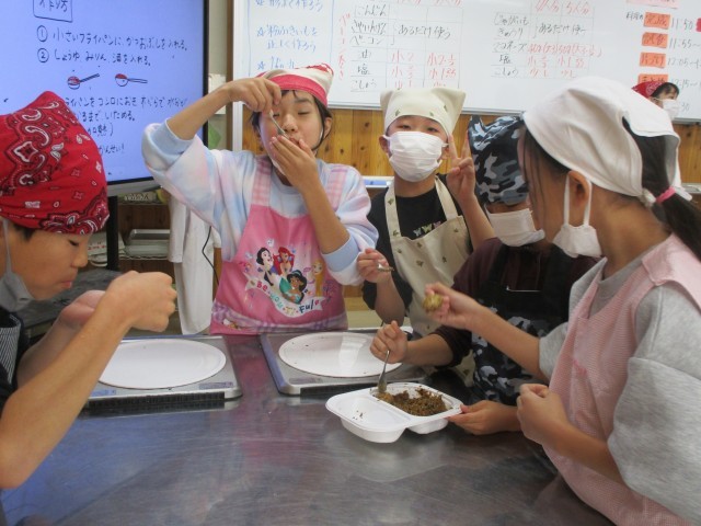 食品ロスについて調べているチームは、給食の残菜について調べていくうちに調理過程でも捨てられているものがあることを知りました。その中で、出汁をとったかつおぶしの利用について調べたところ、ふりかけを作ることができることがわかりました。今日は、栄養教諭の田中先生に教えてもらいながら全員でふりかけを作り、小さなおにぎりにつけていただきました。「おいしいから家でも作ってみたい」「お母さんに食べさせてあげたい」などの声がありましたが、ふりかけだけではなく野菜の皮なども無駄なく使うことができないか考えて、食品ロスが少しでも減るように考えていってほしいと思います。