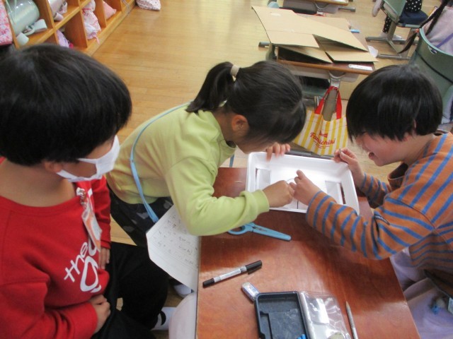 11月に拾ったどんぐりなどを使って秋のおもちゃを作りました。やじろべえ、どんぐりころがし、シュートゲームなど、いろいろなものを楽しんで作っていました。友達のものに興味を持ち、お互いのおもちゃで仲良く遊びました。