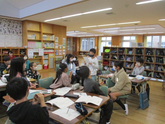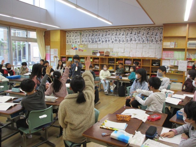 14日(水)国語の授業では、連想を広げてひと言で詩を書きました。友達の詩から、なぜそのように表現したのかみんなで考えましたが、いろいろな連想が出てきました。人によってとらえ方や考え方・見方などが違うことがよくわかりました。