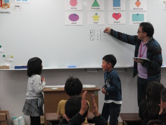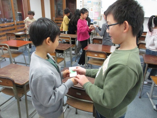 ペアで何の形のカードを持っているか、英語で聞き、当てるゲームをしました〇◆□❤