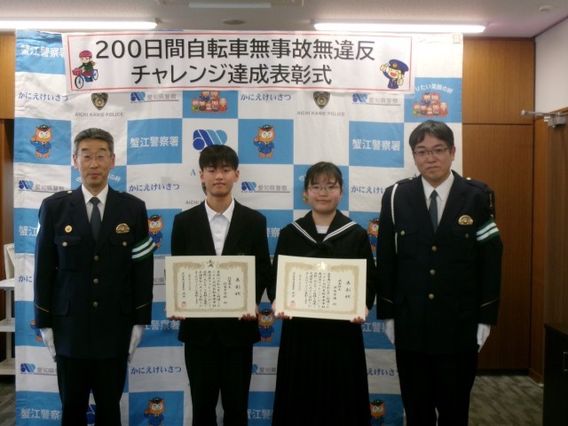 1月26日(月)、「200日間自転車無事故無違反チャレンジ」達成について、蟹江警察から表彰されました。
