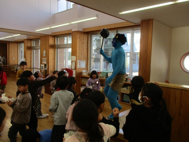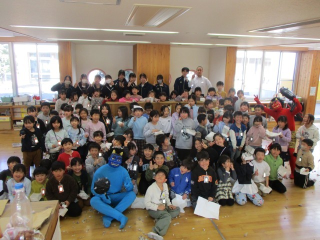 3日は節分でした。飛島学園の1・2年生ワークスペースに赤鬼さんと青鬼さんが来ました。「心の鬼を追い払おう!」の目標を立て、1・2年生が協力して鬼退治を行いました。心の鬼を退治し、優しくなった赤鬼さんと青鬼さんと、写真撮影をしました。最後には、みんなで豆を集め、きれいなワークスペースにもどしました。