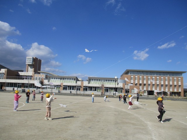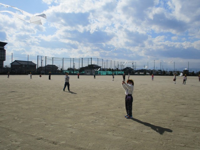今日は風が強く、天気も良かったため、凧揚げをしました。手を離すと、凧が風に乗ってすぐに大空へ揚がりました。