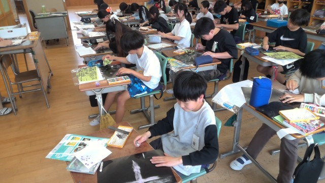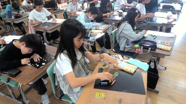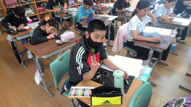 図工で「消してかく」の授業がありました。1面黒色に塗られた用紙を一生懸命消しゴムで消して、白くなった部分にも色を付けて、自由な発想で描いていました。どんな作品が出来上がるのか楽しみです。5年生の図工もいろいろなものを作っていきましょう。