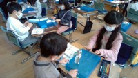 新年最初の5年生の書写の授業は、「書き初め」練習を行いました。縦に長い書き初め半紙にバランスよく文字を配置するため、初めて「立って書く」経験をしました。「腰が痛い!」といった声も聞かれましたが、何人かの生徒は、「紙全体が見渡せる」「なんとなく書きやすい」など、立って書くよさを感じとっていました。どの生徒も、冬休み中にきれいに筆やすずりをきれいに整えてきており、気持ちよく練習に取り組むことができてました。