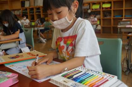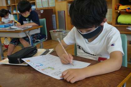 22日(月)国語の授業で、ひらがなの「む」を学習しました。どの子もプリントの文字を丁寧になぞり、「む」のつく色々な言葉を書いていきます。よいペースでひらがなをマスター中です!!