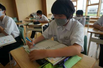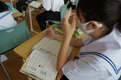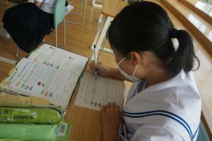 24日(水)アルトリコーダーを配った後、リズムづくりの学習をしました。ドーナツやたいやき等、4文字の言葉を見付け、タンギングやリズムに変換させました。飲み物や教科、好きなアニメ等、生徒たちのアイデア満載!のリズム曲ができそうです。