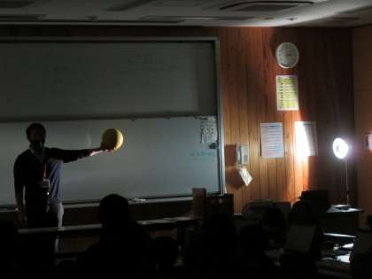 パソコンルームを真っ暗にして、太陽に対して、月に見立てたボールの位置が変わることによって、月の見え方がどう変わってくるかを観察しました。