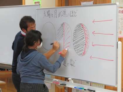 月が太陽に近いとき、離れたとき、う〜んと離れたときを見比べ、月の形をノートに記録しました。なるほど、月の形の変化がよく分かりました!