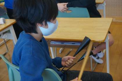 10日(水)もう一つのクラスでは、音楽室に新しく入った楽器を全員で試してみました。全て打楽器ですが、音や演奏方法に特徴があり、どの楽器も次の合奏曲で活躍しそうです。さて、5年生のみなさん、それぞれの楽器の名前、言えますか?