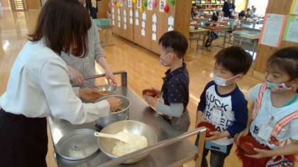 4月11日(月)1年生は、給食の初のおかわりがありました。自分の食べられる量や食事のペースをこれからつかんでいってほしいと思います。好き嫌いなくモリモリ食べて、グングン成長していってほしいです。