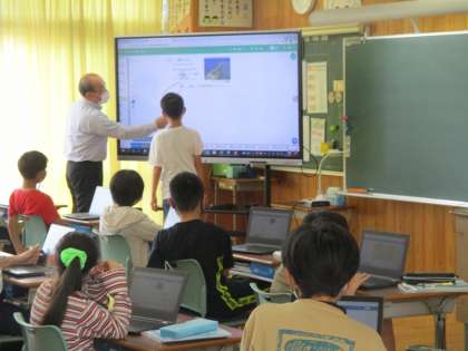 5Aの算数の授業では、電子黒板を使って生徒が自分の考えを説明していました。
