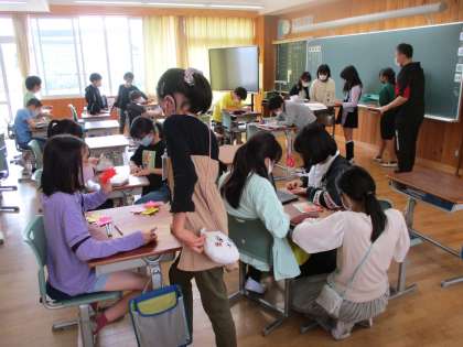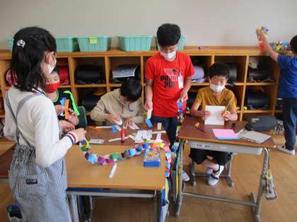 また、5Bでは、学活の時間1年生を迎える会に向けて、グループでアイデアを出し合いながら、協力して準備を進めていました。