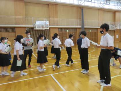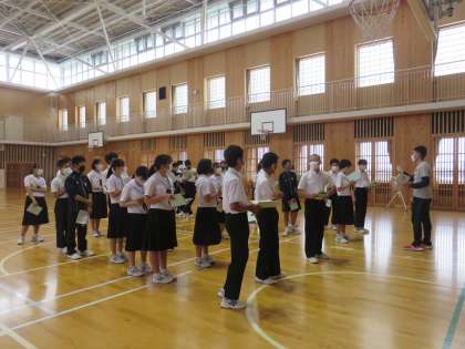 6日(月)1限にアリーナで修学旅行の隊形練習を行いました。
