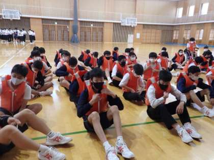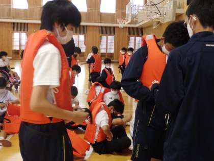 6月6日(月)の学活で、救命胴衣を着用しました。