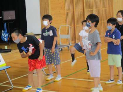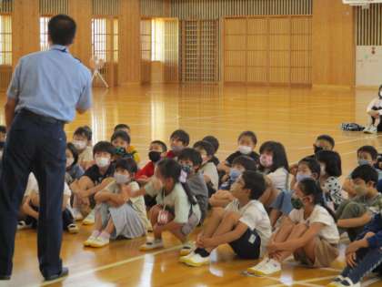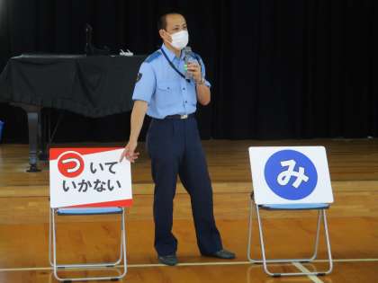 警察の方に連れ去りから身を守る方法を教えていただきました。助けを呼ぶために大きな声を出すことや防犯ブザーを鳴らすことの話の後に、代表者による学級対抗大声勝負をしました。B組の圧勝でした。その後教室で今日学んだことをレポートにまとめました。「つみきおに」を改めて守ろうと考えたようでした。