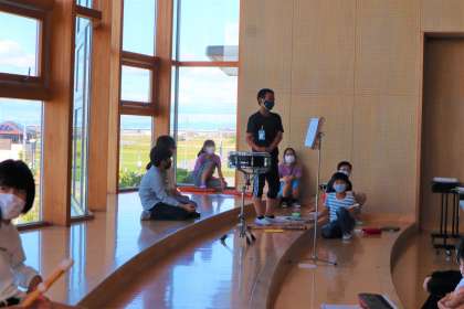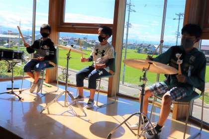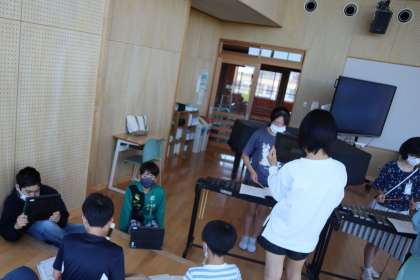 音楽の様子です。「ラバーズコンチェルト」の合奏をしています。楽器ごとに分かれて個人練習をしたり、動画を撮り合って自分の演奏を確認したりしていました。また、グループでの合奏が終わると、聞いていた人から「この楽器の音が大きいからもう少し小さくするといいよ」や「全体的なバランスがよかった」などと伝え合う姿も見られました。来週は本番です。がんばろう!