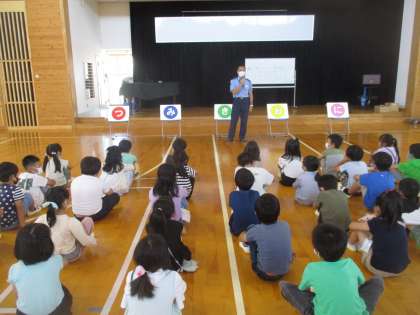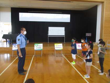 6月7日(火)蟹江警察署ののおまわりさんを講師に招いて防犯教室を行いました。「つ・み・き・お・に」事件に巻き込まれないようにする合言葉を教えていただきました。2年生の様子です。