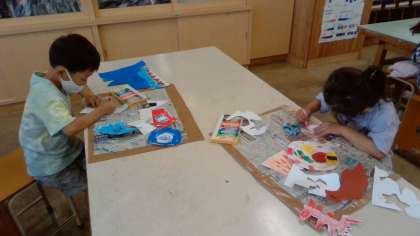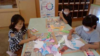 B組は、図工でした。「いろいろなかたちから」を行いました。この紙の形は、どんなものに見えるかな?と考えながら、色を塗っていました。