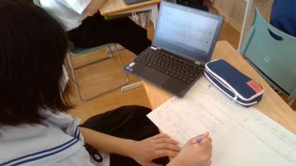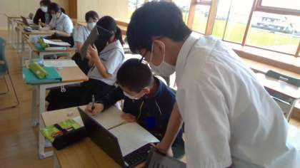 次に、音楽の授業でラヴェルの「ボレロ」を鑑賞しました。まず、デジタル教科書を使って主題Aと主題Bの違いを聴き取りました。「AよりもBの方が暗く感じる」など、ペアで感じたことを話し合う姿が見られました。