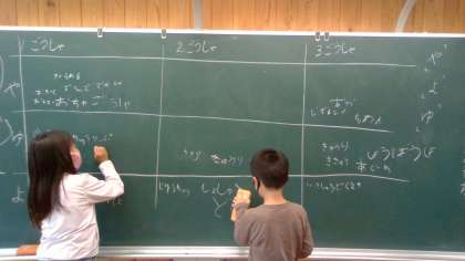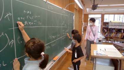 国語の授業では、「おもちやとおもちゃ」をしました。小さい文字「や」「ゆ」「よ」をつく言葉を探しました。号車ごとで対決をし、見事に1号車が21個見つけて、勝利しました。
