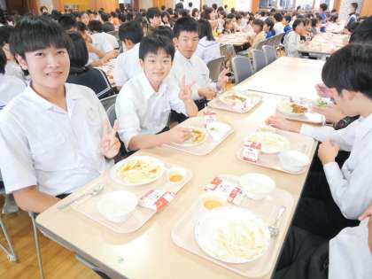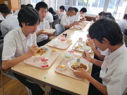 今日は食欲旺盛な9年生の給食の様子をお届けします。今日の献立は、皮ごとやさいのカレーライス。牛乳。ブロッコリーのサラダ。おからのカップケーキでした。いつ見てもまるでおなかに吸い込まれていくような見事な食べっぷり。そしていつも残さず食べる9年生。素晴らしいです。