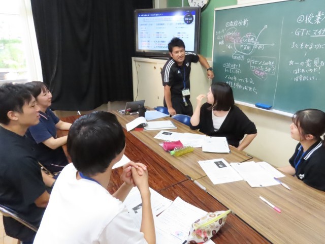 ホワイトボードを活用した教材分析を行った。検討会を教材分析から模擬授業まで3段階に分け、全員の知恵を可視化して繋ぐことで、質の高い授業案を構築する体制を確立した。これにより、教員の教材分析力と授業構想力の向上に繋がった。