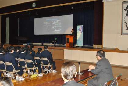 講演の中で、「競技から学んだ七つのこと」として、1目標をもつ 2ポジティブシンキング 3対処法を考える 4強み分析と環境把握 5迅速なスタートダッシュ 6心技体+知(情報) 7目標は口に出す という話がありました。また、「知識や夢が多いほど、将来の可能性が広がるから、学校生活を頑張ってください」と鼓舞してくださいました。