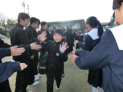 高橋中学校では,月曜日と木曜日に朝の部活動が無いため,生徒会の呼び掛けによって、「あいさつ運動」を行っている。