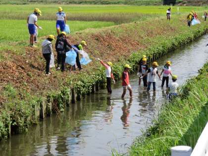 子供たちは、夏には川で生き物を探したり、水遊びをする川です。全校児童たちは、日頃の感謝の気持ちを込めて清掃活動をしました。地域の人々も手伝いにきてくださいました。高学年の子供たちは、ズボンをびしょ濡れにしながら川の中のごみを一つ一つ丁寧に拾っていました。