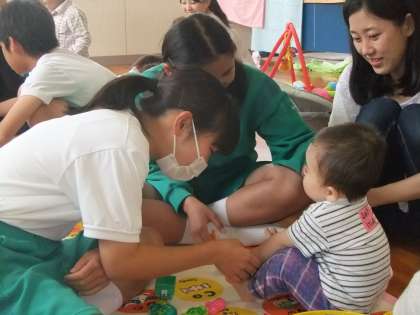 体験を行うに先立ち、生徒たちは自分の家族から出生時のエピソードや名前の由来、幼少期の様子などを聞いていました。体験では地域に住むお母さん方から、赤ちゃん誕生の瞬間や子育てについて話を聞きました。また、乳児を抱っこさせてもらったり、一緒におもちゃで遊んだりしました。
