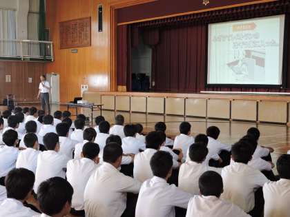 ネットモラル講座は、携帯電話会社の方を講師としてお招きして行った。主な内容は、生徒たちが巻き込まれやすいトラブルの紹介やトラブルの回避方法、犯罪となる行為の紹介、ネットモラルの啓発である。SNSがきっかけとなって起こり得る事件の怖さや文字によるコミュニケーションの難しさ、GPS機能から位置情報が漏れる恐ろしさ、インターネット上に一度載せた情報はデジタルタトゥーといって一生残ってしまうことなど、具体的な事例を生徒は真剣に聞いていた。保護者や地域の方も参加され、生徒を取り巻くインターネット環境の現状について知っていただくよい機会となった。