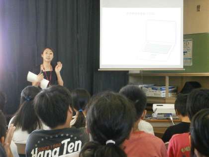 授業は、プロジェクターを使っての説明と、児童へのインタビューによって進められました。授業の内容は携帯電話やスマートフォンのマナーや安全な使い方のほか、児童が理解しやすいようにボールを使った携帯電話のメールシステムについて説明を聞きました。その中では、チェーンメールを転送しないことや個人情報を出さないこと、知らない人とのメール交換は、相手の顔が見えないので危険性が高いなどの話がありました。そして、最後には、「大切な個人情報書いちゃダメ!」「相手の気持ちを考えよう!」「書きこむ前に気をつけよう!」「開いてはダメ!知らないメールと迷惑メール」など携帯電話やスマートフォンを使う際の注意すべき事項が示されました。
