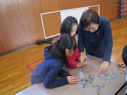 12月15日には、1年生の生活科の「むかしからつたわる、あそびをたのしもう」の授業で、18名の地域の方に授業支援ボランティアとして来校していただき、けん玉やおはじき、こま回しやお手玉など昔の遊びを教えてもらいました。多くの児童は初めて体験する遊びに興味津々で、遊び方を熱心に教わったり、歓声をあげながら一緒に遊んだりしていました。