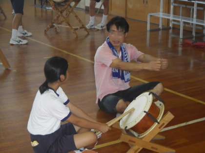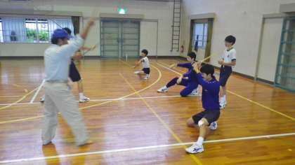 本校の生徒は、地域の方を講師に招き、学区に伝わる芸能を学んでいます。内容は「水神囃子(ばやし)」「棒の手」「歌舞伎」「勘八太鼓」とバラエティに富んでいます。3年間同じ内容のものを学ぶ中で、歴史的背景についての理解を深めたり、講師の方から教えていただいたことを後輩に更に受け継いでいったりできる活動になっています。