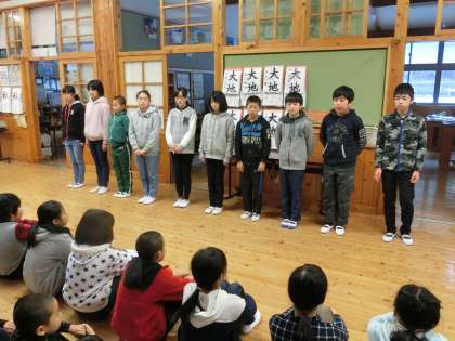毎週水曜日は、「歌声タイム」があり、全校合唱を練習します。3学期、6年生と一緒に行う「歌声タイム」の最後の日のことです。6年生が一人ずつ、下級生に向けてメッセージを発表しました。6年生のある子が、「豊根小学校の歌声のすきなところは、みんなの声が澄んでいることです。これからも、その美しい、澄んだ歌声を目指してください。」と発表しました。また、もう一人の6年生が、「ぼくは、一人で歌うことは得意ではなかったけれど、合唱はみんなの声が合わさってすばらしいものができるから、すごく好きになりました。」と発表しました。6年生の発表を真剣に聞く下級生。6年生の思いが伝わってきました。