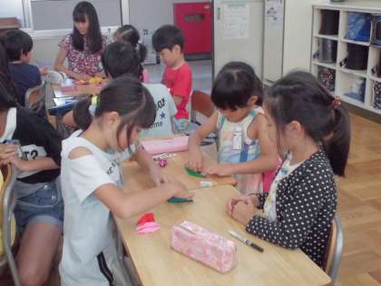 他にも、6年生が、他学年に平和推進学習で広島訪問の際に持って行く千羽鶴の鶴の折り方を教えたり、歌詞カードの作り方を教えたりしています。