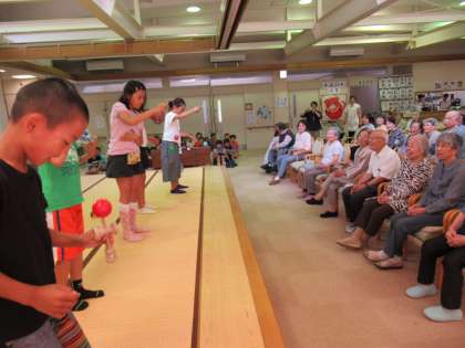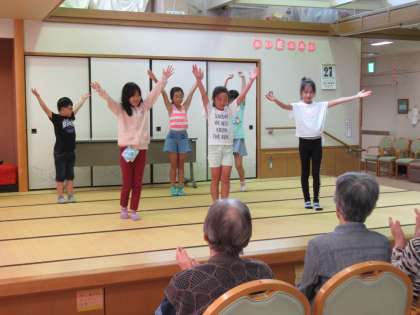 6月末に行われた交流会では、まず、子供たちが自分たちの得意なこと、例えば、ダンス、紙芝居、クイズ、けん玉の技、マジックなどをグループごとに披露したり、色紙で作ったメダルをプレゼントしたりしました。最後には、クラス全員で「ふるさと」「エーデルワイス」の曲をリコーダーで演奏したり、「上を向いて歩こう」を合唱したりしました。グループごとの発表のときは、笑顔とあたたかいまなざしで見守り、最後の全員合唱のときには、子供たちと一緒に口ずさみ、感動して涙ぐんでいた方もいらっしゃいました。一方、高齢者の方からは手作りのキーホルダーとせっけんをプレゼントしていただき、子供たちも大変喜んでいました。