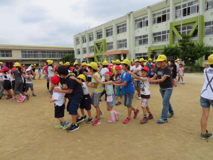 1か月に1回、「ペア遊び週間」を設けて、休み時間にペアで一緒に遊ぶ機会をつくっています。遊ぶ内容は、学級全体やペアの児童同士で考えています。ペア遊び週間中に、児童会役員が企画・運営をする「フレンドパーク」というイベントを行っています。5月は「じゃんけん列車」、6月は「猛獣狩り」、7月は「夏祭り」を行いました。中でも、「夏祭り」は、盆踊りやゲームなどの企画があったり、本校のゆるキャラが登場したりするなど、1〜6年生が楽しめるように工夫されており、大いに盛り上がりました。